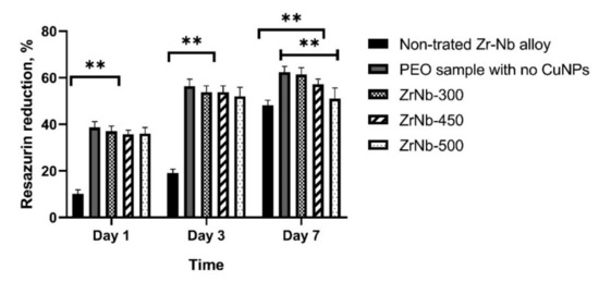The resazurin reduction assay test at different times of osteoblast cultivation in ZrNb samples with PEO in different voltage modes. Asterisks indicate the p value between groups: **—p < 0.001.