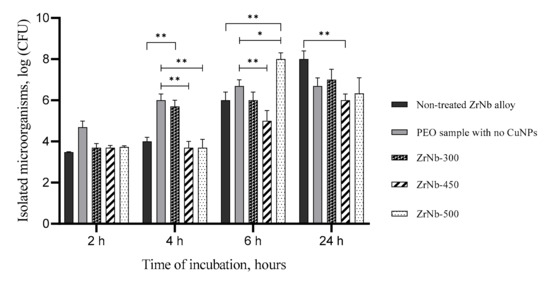 The number of attached bacteria on the surfaces of ZrNb samples at different time points of incubation. The data are mean and SD values. Asterisks indicate the p value between groups: *—p < 0.005; **—p < 0.0001.