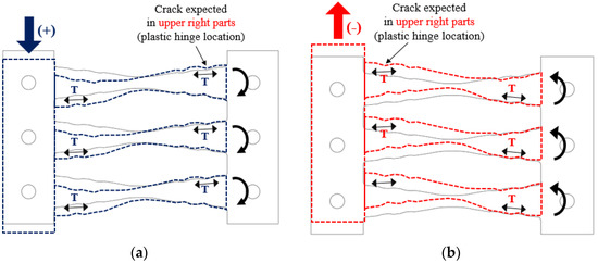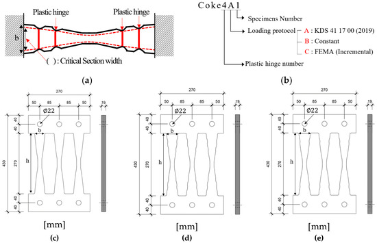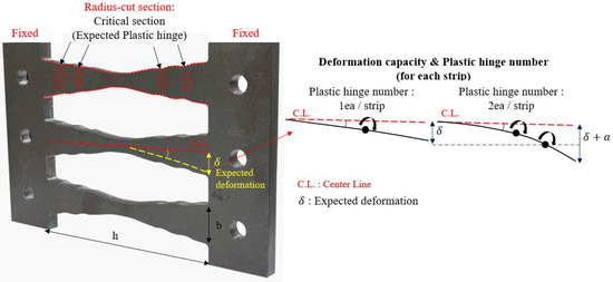 Figure 2 depicts the configuration of the proposed radius-cut coke-shaped strip damper featuring in-plane resistance and comprising fixed end portions and central radius-cut portions. This coke-shaped damper is based on the use of double plates. The height-to-width (h/b) ratio of the strip in this damper is set to be greater than five, which corresponds to flexural deformation rather than shear deformation. The fixed portion is connected using frames with high-strength bolts; the shape of the central portion enables a moment distribution that concentrates the stress at the radius-cut section. Therefore, under an efficient plastic deformation, multiple plastic hinges are expected.