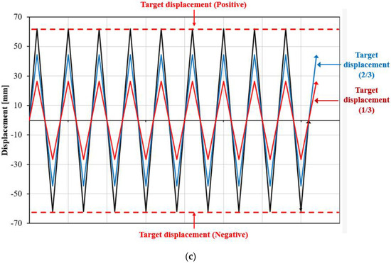 Under the loading protocol of FEMA 461 [27], the target displacement ∆m was set as 62 mm, based on the test results, and the amplitude was increased to 1.4 times the amplitude of the previous step. In addition, the amplitude of each forced step was designed such that the target displacement could be achieved at the 14th step. From the first to the third steps, six cycles of amplitudes were considered under an elastic state; thereafter, two cycles were repeated for each step. Constant loading was also considered to determine the fatigue of the coke-shaped strip dampers.