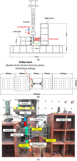 Figure 6 presents the test setup. Considering that the force generated at the connections increased due to the tensile resistance of the strip (i.e., the membrane effect), sufficient bolts were employed in the setup. The experiments were performed using a 1000 kN actuator. The damper was fixed to the left and right frames using a T-shaped Zig, and a high-strength bolt was used to affix the two zigs. To prevent vertical displacement of the T-shaped jig, a Teflon sheet was placed in the gap between the zig and the left and right plates; this sheet also reduced the friction between plates, facilitating sliding. A backplate was also utilized to prevent rotation and to transfer the load from the actuator to the test specimen. A damper plate was installed behind the zig to minimize the generation of moment, thereby ensuring that the applied load was transferred from the actuator to the test specimen.