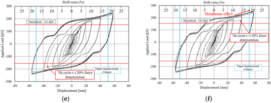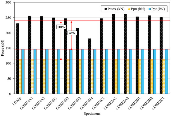 COKE4B1 and COKE2B1 were damaged after five cycles under the maximum displacement. However, the maximum displacement of a given target is calculated considering the MCE level; this is set considering a return period of 2475 years (i.e., 2% in 50 years), which rarely occurs in actual scenarios. Moreover, for a target displacement of 50 mm, the maximum strain of the damper exceeds 18% drift ratio. In this case, the damper is sufficiently deformed. Moreover, if the damper is damaged after five cycles, the damper is said to be sufficiently deformed, although in the KBC2016 testing standard, damper performance is deemed satisfactory if the load does not fall below 15% of the maximum load, over five cycles under the maximum displacement [31]. In addition, the structural safety of the damper against progressively increasing loads was tested using the incremental force loading protocol proposed by FEMA. Figure 8e,f presents the results for the incremental force experiments; these results yield a stable hysteresis curve. For the COKE4C1 test specimen, a force reduction of approximately 5% occurred during the sixth negative cycle; during the seventh positive cycle, the force was reduced significantly by an additional 20%. The experiment was ceased at this point. The behavior of the COKE2C1 test specimen was similar to that of the COKE4C1 specimen; however, the force reduction was initialized earlier than that in the COKE4 specimen, and a reduction of approximately 5–10% occurred during the sixth negative cycle. Moreover, the force was reduced significantly by more than 20% during the seventh positive cycle, and the experiment was terminated. For all specimens, the load increased beyond the theoretical value due to the fully constrained ends of the specimens.