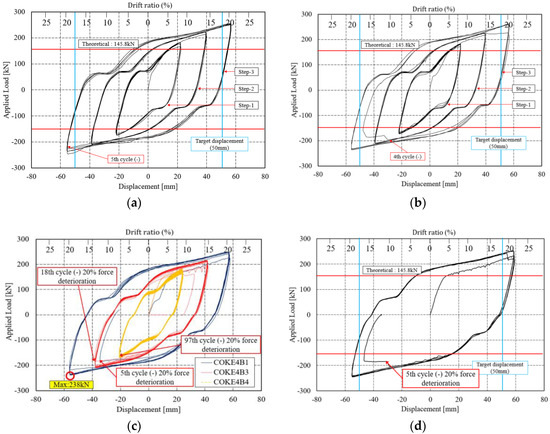 The load-displacement curves of the specimen and the damper drift ratio are plotted in Figure 8. In all the experiments, the slip occurring during the first load is negligible because the bolt is positioned downward and exerts a downward force. During the first loading cycle, the bolt remained fixed; subsequently, it started to deform, which consequently resulted in noise and eventually led to a bolt slip. Figure 8a,b illustrates the applied load and displacement curves when the loading is in accordance with the KDS 41 17 00 (2019) standard. The force reduction in both specimens (i.e., COKE 4 and COKE2) occurred during the third step. For COKE4, it occurred during the fifth cycle in the negative direction, whereas for COKE2, it occurred during the fourth cycle in the negative direction. The experiment was terminated after a force reduction of 20% of the maximum force. According to the regulations of AISC 7–16 and KDS 41 17 00, the target displacement of the damper device is based on the expected device displacement during the maximum considered earthquake. The damper performance is considered to be satisfactory if the damper does not break for ten times at 0.33 times the target displacement, five times at 0.67 times the target displacement, and three times at 1.0 times the target displacement. In accordance with these criteria, the proposed coke-type strip damper was discontinued after the performance requirements were satisfied.