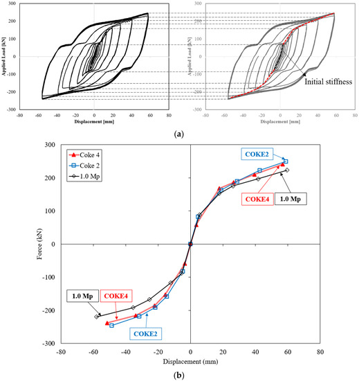 Figure 9 presents the skeleton curve that was used for an accurate comparison between the initial stiffness and yield strength. This monotonic curve was produced by connecting the maximum force in each cycle of the hysteresis loop; the results coincide with the monotonic curve for the static load test. This was used as an index to estimate the plastic deformation capacity by Kato [32]. The stiffness, which is one-third of the initial stiffness, is translated to a vertical axis and the point in contact with an arbitrary line of the load-displacement curve is evaluated as the yield point by Moehel’s method. The skeleton curves of the COKE4 and COKE2 specimens are highly similar; the maximum force of COKE4 lies between those of the COKE2 specimen and the 1.0 Mp model. According to the skeleton curve, the yield displacement and stiffness of the damper were found to be 5.5 mm (yield force 88 kN) and 16.0 kN/mm for the 1.0 Mp specimen, 4.73 mm (yielding force 82.4 kN) and 17.4 kN/mm for the COKE2 specimen, and 3.47 mm (yielding force 58.3 kN) and 16.8 kN/mm for the COKE4 specimen, respectively. The yield point of the coke-shaped damper exhibited a tendency to occur earlier as the number of cross-sectional defects (i.e., plastic hinges) increased.