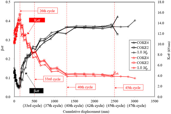 Figure 11 presents the effective stiffness () and effective damping (). The effective stiffness gradually decreases as the cumulative plastic deformation increases; the maximum effective stiffness appears during the 26th cycle, and the effective damping range is between 5% and 40%, which are opposite trends with the effective stiffness. During the 26th cycle, the lowest effective damping was observed; furthermore, as the cumulative number of cycles increased, after the 26th cycle, the effective stiffness of the damper gradually decreased, and the damping and the slope of the energy dissipation capacity increased (Figure 12). The stiffness gradually decreases, the damping gradually increases, and the graph crosses at the 33rd cycle. While experiencing cumulative deformation corresponding to the 40–45th cycles, there was a negligible decrease in damping, and it did not increase significantly until the occurrence of fractures after the 45th cycle. Moreover, in this region, ductility remained constant, although the damper was destroyed (Figure 13).