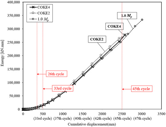 Figure 12 presents the energy dissipation under the incremental loading protocol. The results indicated that both the COKE4 and COKE2 specimens exhibited considerably similar results and that the energy dissipation capacity of the coke-shaped damper was higher than that of the 1.0 Mp damper for all the cycles. However, the 1.0 Mp damper sustained a larger number of loading cycles than that of the coke-shaped damper; therefore, the cumulative dissipation energy of the 1.0 Mp damper was higher.