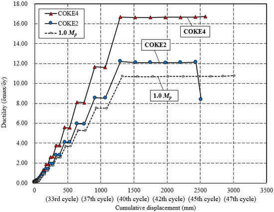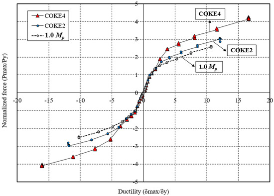 Figure 13 presents the variation in the ductility of each test specimen with respect to the cumulative strain. Specifically, it compares the ductilities of the 1.0 Mp, COKE4, and COKE2 models for all cycles. COKE4 exhibits a more gradual change in ductility as compared with the 1.0 Mp and COKE2 models. When a plastic hinge was created due to an intentional defect in the cross-section, the initial yield point was achieved faster. However, when conditions of the cross-section were identical, it was observed that the final fracture point occurred in a similar manner. Furthermore, in terms of ductility, the COKE4 model with four plastic hinges per strip was superior to the COKE2 model with two plastic hinges per strip. Thus, it was confirmed that an increase in the number of plastic hinges led to improved ductility. However, the number of specimens was considerably limited; therefore, additional FEM analyses were conducted, as detailed in Section 4.5, to estimate the effect of the number of plastic hinges on ductility. Figure 14 indicates the difference in the load resistance capability of each specimen for the same ductility. In this case, the normalized force (Pmax/Py) was the highest for COKE4, and this was followed by COKE2. The 1.0 Mp test specimen exhibited the lowest load resistance because its cross-sectional area was 20% smaller than those of the other specimens.