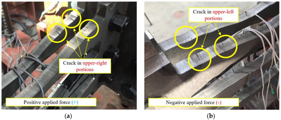 Figure 16 illustrates the deformation and fracture of the specimens. The fracture of the specimens initializes with noise, and small cracks are formed within the vicinity of the plastic hinges as the amplitudes of the specimens increase. The upper-right portion of each strip is subjected to tension under a positive force (downward), whereas the upper-left portion is subjected to tension under a negative force (upward). The cracks gradually deepen and result in the formation of a fracture. This leads to a rapid reduction in strength, after which the experiment was terminated. It was confirmed that cracks were generated at the plastic hinges on the upper-right portion of the strip during applied positive and negative forces. In addition, cracks were created at the upper-left portion, which was subjected to negative tensile force. The fracture phenomena in all specimens were similar.