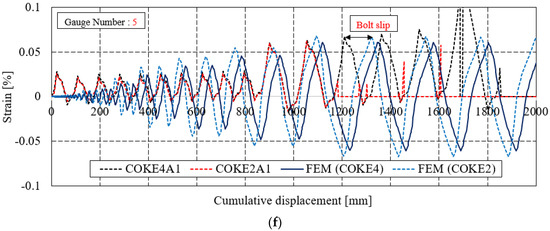 Figure 18 depicts the strain distribution on a strip of the damper with respect to the cumulative displacements. The results of both COKE4 and COKE2, under the KDS 41 17 00 (2019) loading protocol, exhibit similar trends. Neglecting the deviation due to bolt slip, the FEM analysis results were almost identical to the experimental values, at the maximum strain. Gauge No. 3 represents the specimen behavior within the elastic range, and Gauge Nos. 1, 2, 4, and 5 denote those within the plastic range. In addition, the results show that the strip damper exhibits flexural behavior at both ends, and a plastic hinge was generated in the reduced cross-section. FEM analysis was used to confirm stress concentration; the definition of specimen fracture was not considered in the analysis. It was confirmed through the FEM stress distribution that it exceeded the yield in the radius-cut region and was in the plastic region. Fractures occurred and indicated the early termination of gauge response as compared with the FEM response for some of the gauges.