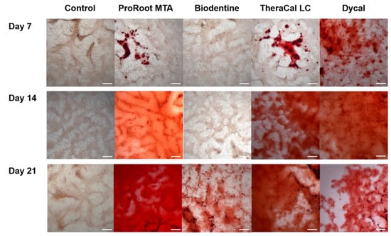 - Margunato, S.; Tasli, P.N.; Aydin, S.; Karapinar Kazandag, M.; Sahin, F. In Vitro Evaluation of ProRoot MTA, Biodentine, and MM-MTA on Human Alveolar Bone Marrow Stem Cells in Terms of Biocompatibility and Mineralization. J. Endod. 2015, 41, 1646–1652. [Google Scholar] [CrossRef] [PubMed]