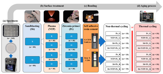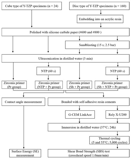 The sandblasting was performed with dental sandblaster (Basic master, Renfert, Hilzingen, Germany) using 50 µm aluminum oxide (Al2O3) (Hi-Aluminas, Shofu Inc., Kyoto, Japan) at 2.5 bar for 15 s (Figure 1b) [34]. After sandblasting, all the Y-TZP specimens were ultrasonically cleaned in distilled water for 3 min and air-dried. NTP was supplied to specimens using a plasma generating device (FG-Explorer, FEAGLE, Yangsan, Korea) with argon (Ar) gas, which was operated at a flow rate of 5.0 slm (standard liter per minute), 3 kVpp, and 4.80 mA. Additionally, NTP treatment was implemented 10 mm above of the specimen surface for 1 min (Figure 1b). Then, Zirconia primer (Z-Prime Plus, Bisco Inc., Schaumberg, IL, USA), containing 10-Methacryloyloxydecyl dihydrogen phosphate (10-MDP), was applied to surface of specimens using microbrush and air-dried with an air syringe for 5 s (Figure 1b). Figure 2 summarizes the study protocol, and Table 1 shows how the groups are divided.