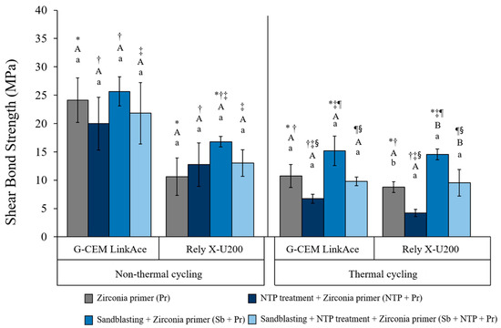 The results of SBS for all experimental groups according to surface treatment methods, effect of thermal cycling and the type of self-adhesive resin cement. The same symbols (*,†, ‡, ¶, §) indicate a significant difference between surface treatment within the same cement type of the same thermal effect (p < 0.05). The same upper case letters (A, B) indicate a significant difference between cement types within the same surface treatment of the same thermal effect (p < 0.05). The same lower case letters (a) indicate a significant difference between thermal effect within the same surface treatment of the same cement types. (p < 0.05). Pr, Zirconia primer; NTP+Pr, NTP + Zirconia primer; Sb+Pr, Sandblasting + Zirconia primer; Sb+NTP+Pr, Sandblasting + NTP + Zirconia primer.