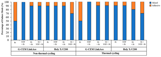The failure mode of all experimental groups is shown in Figure 7. An increase of adhesive failure mode after thermal cycling appeared at Sb + Pr group cemented with Rely X-U200 cement. In all other groups except this group, the percentage of adhesive and mixed type of failure mode was maintained after thermal cycling. Figure 8 shows representative images of each group that were classified according to treatment method. All images show the mixed type of failure mode.