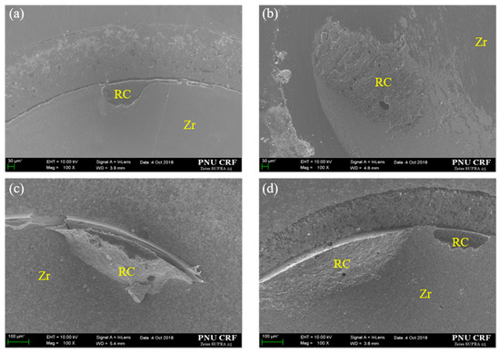 Representative FE-SEM images (×100) of the Y-TZP for each surface treatment method after thermal cycling and SBS test. (a) Pr, Zirconia primer; (b) NTP + Pr, NTP + Zirconia primer; (c) Sb + Pr, Sandblasting + Zirconia primer; (d) Sb + NTP + Pr, Sandblasting + NTP + Zirconia primer. (a–d) show mixed failures. RC, resin cement; Zr, Y-TZP surface.
