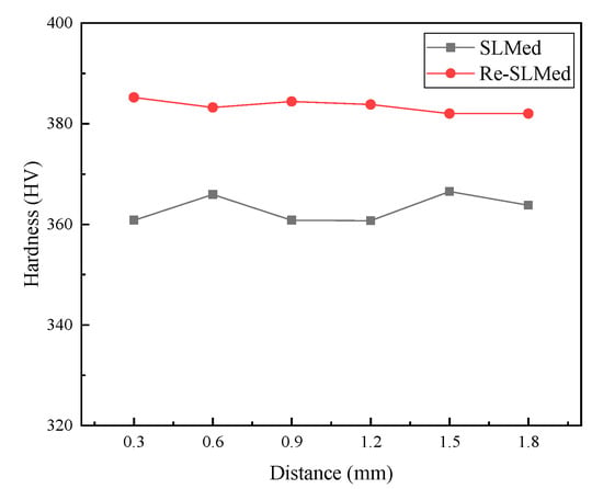 - The rescanning process could improve the relative density of the Ti6Al4V alloy. The number and size of the pores were greatly reduced. Because of the improvement in the relative density, the hardness was also improved. As for the microstructure, the grain boundary of the β phase was greatly expanded by remelting.