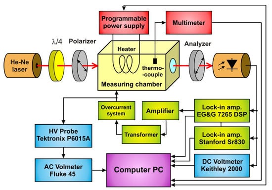 Polarimetric methods are considered to be particularly simple in applications and, at the same time, precise. They are based on an analysis of changes in the light intensity propagating through an optical system consisting of a polarizer, sample, and analyzer. These changes result from the electric field-induced phase differences between interfering rays. The polarimetric technique is usually recognized as applicable in the measurement of induced birefringence in those cases where no natural birefringence occurs or the birefringence is compensated. Previously, we attempted to use a dynamic polarimetric technique to measure QEOE coefficients, which did not require any prior compensation for natural birefringence. We used the changing position of the modulator operating point on the characteristic of its transmission [