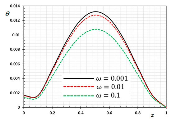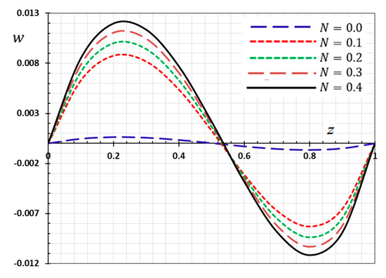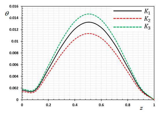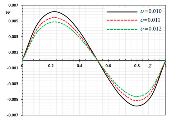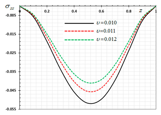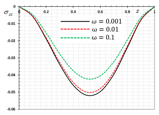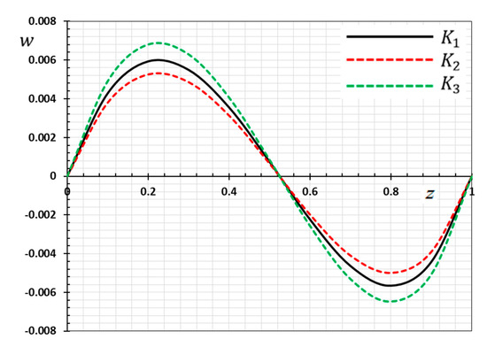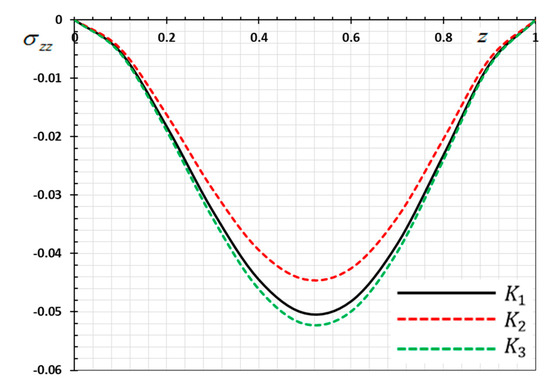 Figure 2 is depicted to display the difference in the distance versus the displacement values for the same selections of kernel functions , as stated previously. We noticed that the displacement distribution is an oscillating distribution that is very similar to the sine function. The displacement variation was detected to increase in and then to decompose away from the plane to reach the minimum value near , and finally it increased again in . It is observed from the figure that the displacement vanishes on the surfaces , which satisfies the proposed mechanical boundary conditions, as shown in Equation (44). It can be found from Figure 2 that the peak values of the magnitude of are greater for than , compared the peak of .
