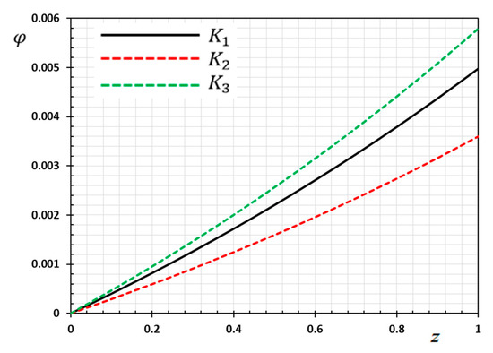Figure 12 is plotted to show the electric potential variation of the functionally graded rod compared to for different values of gradient indicator . From the curves in Figure 12, it is verified that the values of increase with increasing . Moreover, it was noticed that the presence of the gradient coefficient affects the electric potential increase.