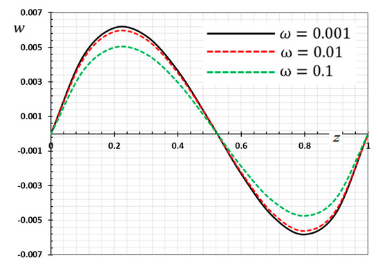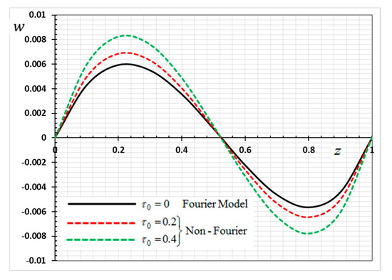 Variation of displacement w versus z for Fourier and non-Fourier models.