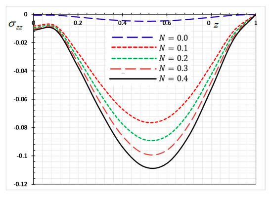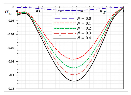 The numerical results of the nondimensional normalized stress of the functionally graded rod along the -axis for various values of the nonhomogeneity parameter are revealed in Figure 11. As shown in Figure 11, a significant difference in the stress was observed with the change in the values of the nonhomogeneity parameter . From Figure 3, it may be found that the absolute of the stress increases with the increase of the parameter .