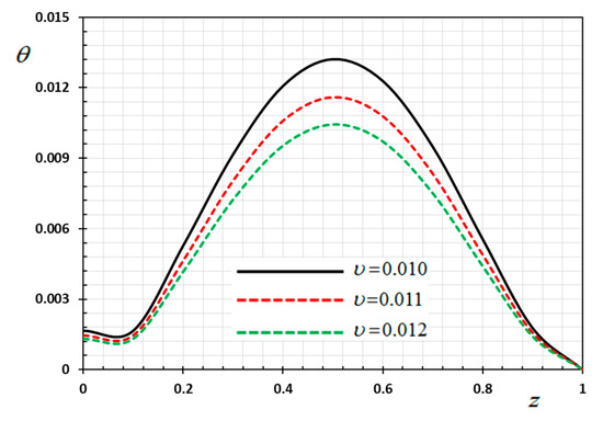 In this case, the influence of the velocity of movable heat source on the distribution of the field variables ( and ) have been studied. The variations for the different distributions are shown in Figure 13, Figure 14, Figure 15 and Figure 16. The numerical results are calculated when the other parameters are fixed (, ) and in the case of . As an example of the effect of the parameter , three different values of the parameter are taken into consideration, which are , , and . From Equation (35) it is clear that the heat source emits its maximum energy at the position , which result in the peak value. We detected that the various values of the parameter of the heat supply speed have an important effect on all fields. It has been observed that the different values of the heat source velocity parameter v (2.0, 3.0, 4.0) have an important impact on all physical fields. As shown in Figure 13, Figure 14, Figure 15 and Figure 16, the magnitudes the nondimensional variables increase with increasing velocity of the moving heat resource. The effects of the heat source transmission speed on all the considered quantities are very large, as obviously shown by the greatest values of the curves. The effect of the heat source is an intrinsic factor that cannot be ignored when assessing heat stress and fields at the source of moving heating problems [54].