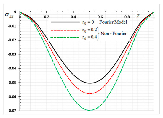 Variation of thermal stress σ_zz versus z for Fourier and non-Fourier models.