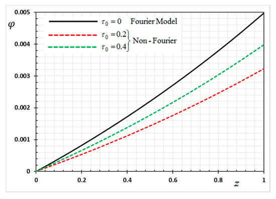 Variation of electric potential φ versus z for Fourier and non-Fourier models.