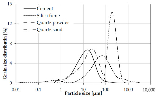 Grain composition of cement, silica fume, quartz powder, and quartz sand.