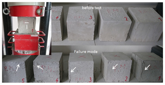 The experimental work started in mixing, casting, and testing the mechanical properties of ordinary and high-strength concrete. Consequently, thus, three sets of specimens for mechanical properties testing were prepared to determine the compressive and flexural strength as well as elastic modulus of ordinary concrete but also RPC with the addition of steel or basalt fibers. The mechanical performance of the produced RPC was primarily considered by compressive strength, evaluated by exchanging different fibers according to EN 12390-3 [28]. Three sets of concrete cubes (150 mm × 150 mm × 150 mm) were prepared. Each set consisted of three specimens, cast in steel molds, and demolded 24 h later. Figure 2 gives the concrete specimen on the testing machine producing predominantly compression.