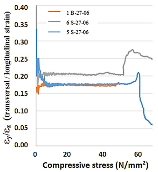 The cube specimens were also used to determine other material characteristics. Although a different aspect ratio of the samples compared to the cubes would be more appropriate to exclude the influence of the dimensions. They were instrumented with four strain gauges on the opposite sides. Two of them were used for vertical strain measurement and the further two for transversal horizontal strain recording. During the compressive test, the load history was measured by a universal testing machine, while the strains of the specimen were obtained by averaging two sideways gages values, as shown in Figure 2. Thus, Poisson’s ratio could be identified. An example of its values as load function is given in Figure 3. In the linear range, this ratio rose from 0.18 to 0.20.