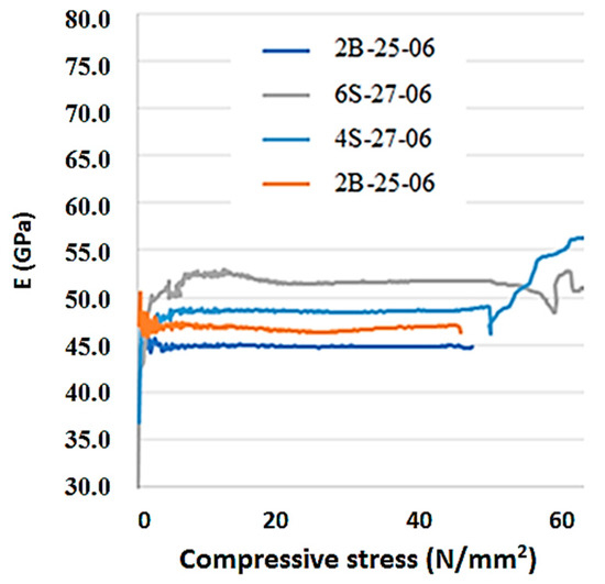 The Young’s modulus E computed with the longitudinal strains on the elastic part of the curve in Figure 4 was 54 GPa, and in the case of basalt microfibers, slightly less, 47 GPa. Damages, accompanied by a reduction in the modulus values, only have occurred above 50% of the ultimate average compressive strength.