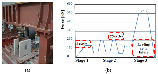 Push-out specimens were kept over a steel base plate. The contact surfaces of steel and concrete were cleaned and smoothened to avoid eccentric loading. The specimens were tested using a universal testing machine until complete failure. Dial and strain gauges were mounted at critical locations, as shown in Figure 7 and Figure 8. The test procedure began with load increments of 20 kN up to 160 kN, a value representing about 40% of expected ultimate carrying capacity for checking the performance of the instruments mounted at the specified locations. This was followed by 25 repeated loads from 40 kN to 200 kN. Then, imposed displacement loading continued up to the failure at the speed of 1 mm in 2 min.