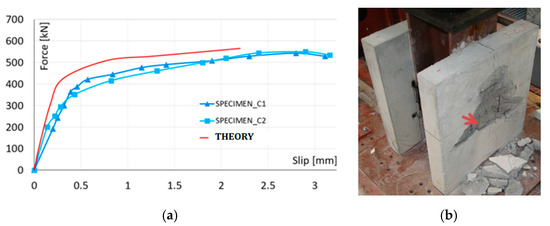 For both types of RPC push-out specimens, the experimental slips, similarly, initially were increasing proportionally to the slightly higher loading level of 273 kN, as shown in Figure 12. However, with the increasing load, the diagrams presented new faster overall slip development. The slips under supplementary loading were around 3.5 mm at the end of the test and the ultimate force value of 788 kN, so by a third larger than in the case of ordinary concrete. Finally, the connection failed by cracking in ordinary concrete slab parts without RPC encasement local damages as well as no shear connector defects. Thus, the bending failure of connectors did not need to be taken into consideration due to favorable load transmission by RPC encasement.