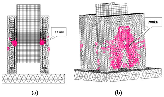 Theoretically different cracking of RPC specimens in intermediate stage (a) and at remarkably higher ultimate load (b).