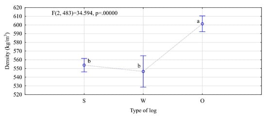 Density of analyzed timber (W—top logs, S—middle logs, O—butt-end logs. The letters denote uniform groups, as determined by Tukey’s HSD (honest significant difference) test).