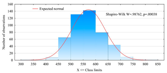 The tested timber did not follow a normal density distribution (Figure 4). Its density distribution was characterized by a skewness of 0.343 and kurtosis of 0.361. Hence, the timber’s density distribution had a positive skew, which means that the most of analyzed timber items were characterized by densities below 600 kg/m3. This was confirmed by previous observations and data concerning the number of items originating from the various locations along the tree length. It should be noted that the number of butt-end logs was half that of the middle logs.