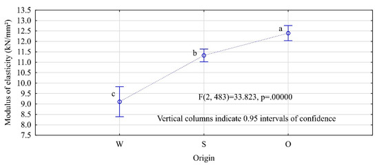 MOE of timber depending on the location of the log along the tree length (W—top logs, S—middle logs, O—butt-end logs. The letters denote uniform groups, as determined by Tukey’s HSD test).