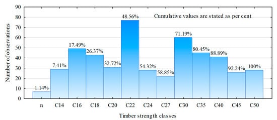Figure 7 shows the number of items representing the respective classes of timber strength and the cumulative percentage of the number of unclassified timber items relative to class C50.