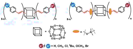 Polyhedral oligosilsesquioxanes with the general formula (RSiO3/2)n are currently one of the most attractive organosilicon compounds [1,2]. Among many advantages of these compounds, i.e., exclusive properties derived from a chemically and thermally robust organic-inorganic framework, and tailor-made three-dimensional structures, the ease of their modification by many synthetic methods is of the utmost importance. The simple functionalization of the inorganic core, as well as of the organic moieties attached to it, allows one to create various structures and to control the properties of the obtained materials. Among the highly valuable synthetic procedures for the functionalization of silsesquioxanes (SQs), we can list Heck coupling [3,4,5], Sonogashira coupling [6], hydrosilylation [7,8,9,10,11,12,13,14,15], cross-metathesis (CM) [16,17,18,19], silylative coupling (SC) [20], O-silylation [21,22] and Friedel–Crafts [23]. They are all dependent on the type of the functional group attached to the Si–O–Si (SiHC=CH2, SiH SiOH). The utilization of these multiple protocols provides a wide range of inorganic/organic hybrid systems that find great application potential in material chemistry, optics, electronics, and catalysis, as well as in medical science [2,24,25,26].