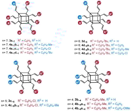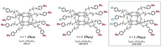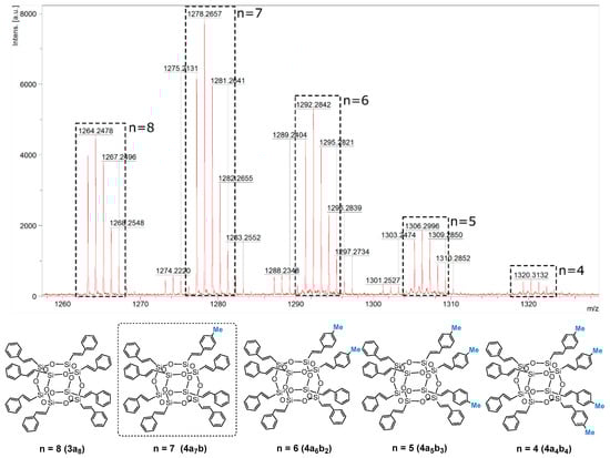 The MALDI-TOF analysis indicated the formation of a mixture of statistical substitution (Me–C6H4–CH=CH–)8−n(C6H5–CH=CH–)nSi8O12 (where n = 8, 7, 6, 5, 4) and the presence of respectively functionalized compounds at a ratio of 23:40:26:9:2, with a predominance of the desired compound 4a7b (Me–C6H4–CH=CH–)8−n(C6H5–CH=CH–)nSi8O12 (where n = 7) (which can occur with different constitutional isomers) [52] (Figure 2). This result is also evidence of the statistical substitution in the case of 3a7, where a complete substitution of vinyl groups could be observed (3a8), which was also confirmed by MALDI-TOF.