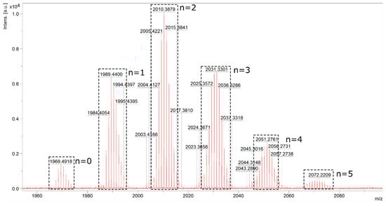 The calculated masses of the sodiated molecules of the respective molecules are: C87H117ClO20Si16Na (n = 1, 7b7c1)—1987.40, C86H114Cl2O20Si16Na (n = 2, 7b6c2)—2007.35 and C85H111Cl3O20Si16Na (n = 3, 7b5c3)—2027.29. The MALDI-TOF spectrum presented in Figure 3 shows the statistical distribution of bifunctional SQs, with the most intensive signal corresponding to a 2:6 substitution of the styrenes moieties (2b and 2c) used in the reaction. The products (7) were fully characterized by 1H, 13C and 29Si NMR to confirm their structures, and the spectra are available in (Electronic Supporting Information) ESI (see Supplementary Materials).