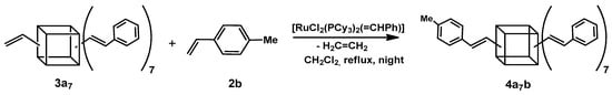 In the first step, we examined the possibility of obtaining a non-fully functionalized silsesquioxane core with one free vinyl group. Treatment of the 1 equiv. octavinylsilsesqioxane (OVS) with 7 equiv. of styrene (2a) in CH2Cl2 at 45 °C in the presence of the first-generation Grubbs’ catalyst gave rise to the slow evolution of ethylene and formation of heptasubstituted silsesquioxane (3a7) (Scheme 1).