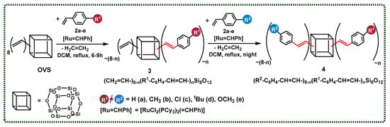 Two-step functionalization of octa(vinyl)silsesquioxane via cross-metathesis, resulting in the formation of 3 (CH2=CH–)8−n(R1C6H5–CH=CH–)nSi8O12 and 4 ((R2–C6H4–CH=CH–)8−n(R1–C6H4–CH=CH–)nSi8O12). Reaction conditions: DCM, 1st generation Grubbs catalyst, [Ru] = 1.00 mol%, reflux, argon. The molecules designed to be obtained by the reaction’s stoichiometry are presented.