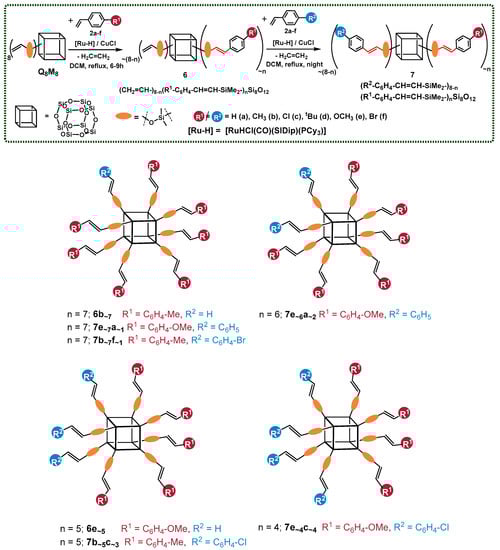 Two-step functionalization of octakis(dimethylvinylsilyloxy)silsesquioxane via silylative coupling, resulting in the formation of 6 (CH2=CH–SiMe2–)8−n(R1–C6H4–CH=CH–SiMe2–)nSi8O12 and 7 (R2–C6H4–CH=CH–SiMe2–)8−n(R1–C6H4–CH=CH–SiMe2–)nSi8O12). Reaction conditions: dichloromethane (DCM), [RuHCl(CO)(SIDip)(PCy3)]/CuCl, [Ru]:[Cu] = 1:5, [Ru] = 1.00 mol%, reflux, argon. The molecules designed to be obtained by the reaction’s stoichiometry are presented.