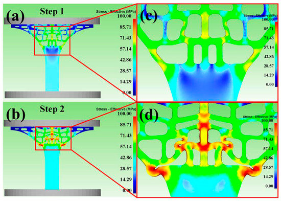 Predicted effective stress distribution during compression at the different steps: (a,b) Stress-effective at Step 1 and Step 2; (c,d) the enlarged view.