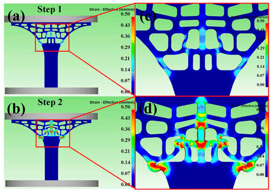 Predicted effective-strain distribution during compression at the different steps (a,b) Strain-Effective at Step 1 and Step 2; (c,d) the magnified view.