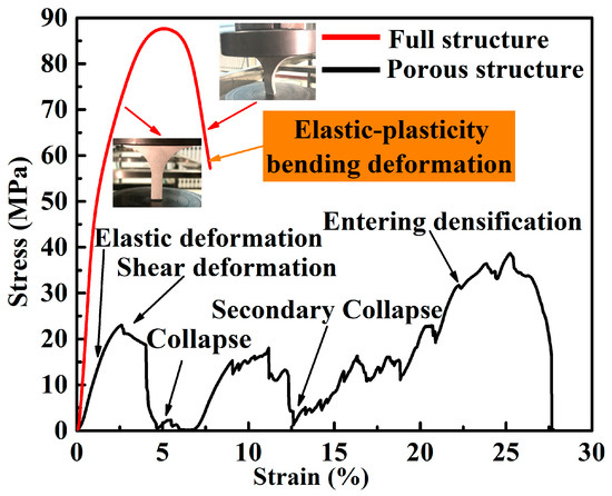 Figure 7 showed the stress-strain curve distribution of the tree column structures-type AlSi10Mg alloy branches and a full (non-porous) structure samples with an identical outline. Insets are photographs showing the elastic-plasticity bending deformation of a full (non-porous) structure samples with the identical outline, and the deformation mainly occurred in the support part of the lower half of the alloy sample. Further analysis showed that the compressive strength of the compact sample is poor, and the ultimate compressive strength (UCS) is obtained when the strain is 5.09%. In contrast, for the tree column structures-type AlSi10Mg alloy branch, the AlSi10Mg alloy branch showed relatively tortuous deformation behavior, with a strong compression resistance up to approximately 25.22% strain before entering densification (Table 2), indicating excellent ductility. Compared with the conventional AlSi10Mg lattice structures manufactured by SLM (the entire structure has a regular and evenly distributed pore structure, and it usually has four different deformation stages: elasticity, shear, collapse, and densification), the branches with the lower part of the supporting body and the upper part of the porous body in this experiment collapsed twice. This as based on the fact that the stress concentration at the interface (dense body and porous body) of AlSi10Mg alloy branches with tree column structure was relatively serious and collapsed first (Figure 8c). With the compression continued, the upper part of the porous body also began to collapse (Figure 8d,e). Finally, with the further compression, the upper rigid plate and the bottom rigid plate squeezed the tree column structures-type AlSi10Mg alloy branches, leading the porous branches to enter the densification stage, which made the broken debris or struts forced to contact (Figure 8f).