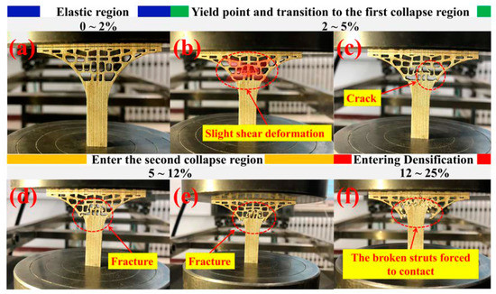Deformation snapshots of the tree column structures-type AlSi10Mg alloy branches at different deformation stages under compression: (a) elastic region, (b,c) yield point and transition to the first collapse region, (d,e) the second collapse region, (f) densified region.