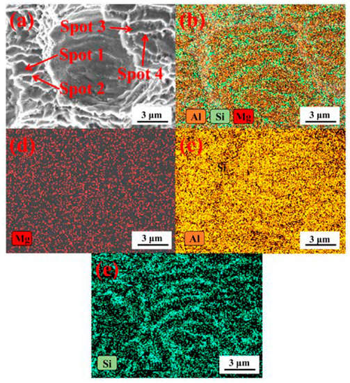 Figure 12 showed the EDS analysis of the fracture surface. The Al element and Mg element of the tree column structures-type AlSi10Mg alloy branches were evenly distributed on the fracture surface, and the influence of the unevenness of the fracture surface on the distribution of fracture elements was excluded (Figure 12c,d). Moreover, the distribution of the Si element on the fracture surface was related to the distribution of the dimples (Figure 12e).