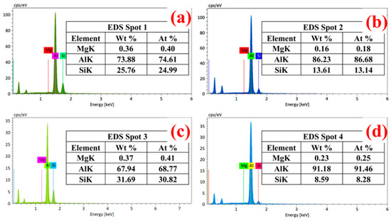 In order to further quantitatively analyze the Si content in the dimple, the corresponding spot analysis was carried out on the bottom of the dimple and the edge of dimple (Figure 13). It was found that the Si content at the bottom of the dimple was 25.76 and 31.69 wt % (Spot 1, Spot 3 Figure 13a,c), while for the dimple edge, the Si content was only 13.61 and 8.59 wt % (Spot 2, Spot 4 Figure 13b,d). Therefore, a key conclusion was established: the Si content at the bottom of the dimple is higher than that at the edge of the dimple. Micropores gathered and grew until rupture occurred, which was the root cause of the Si content at the bottom of the dimple being higher than that at the edge of the dimple.